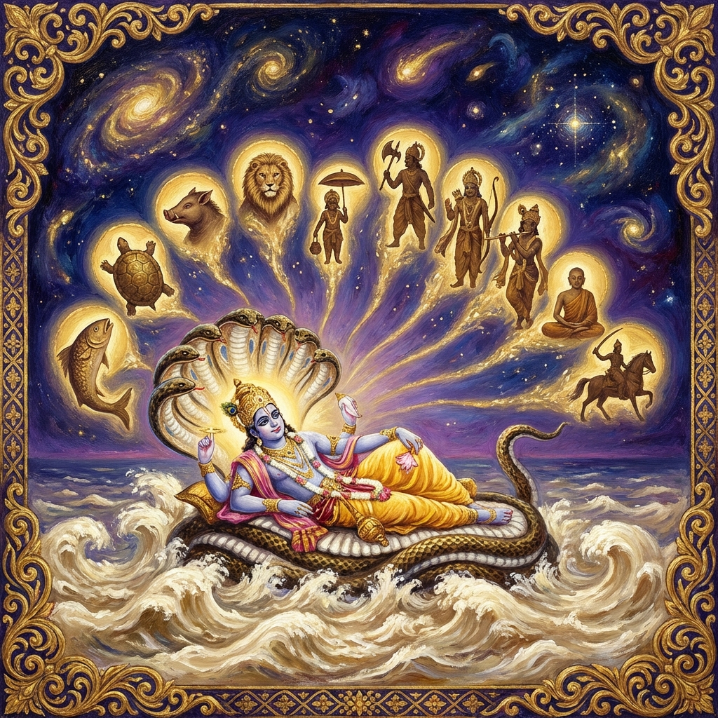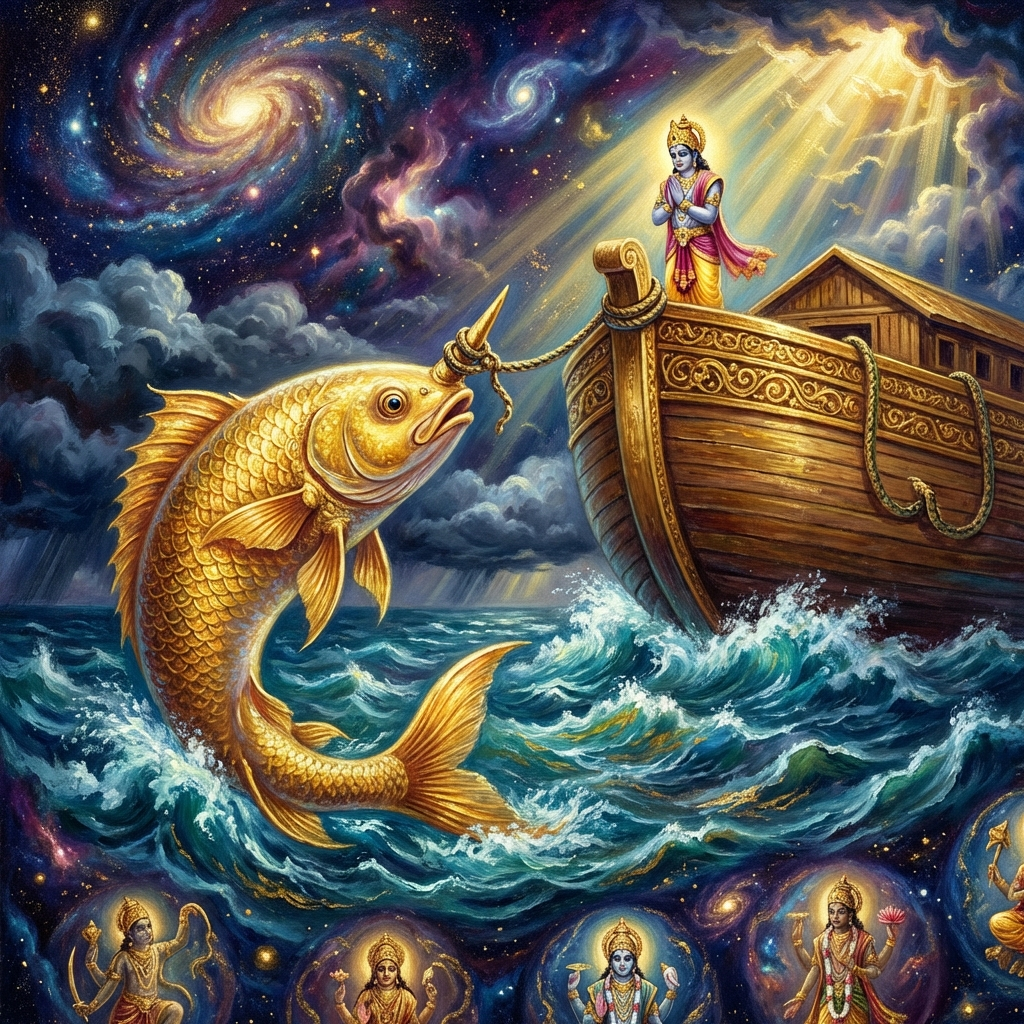 A tiny fish in a king's cupped hands grows to fill the ocean, warns of the deluge, and pulls the boat of creation across the waters of dissolution.