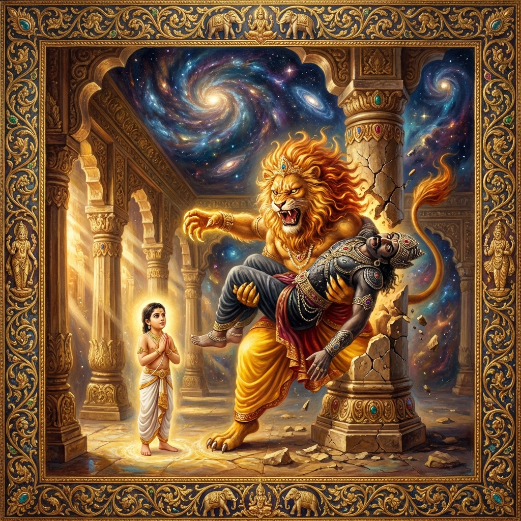 A boar no larger than a thumb erupts from Brahma's nostril, grows beyond measurement, dives to the ocean floor, and lifts the drowned Earth on his tusks.